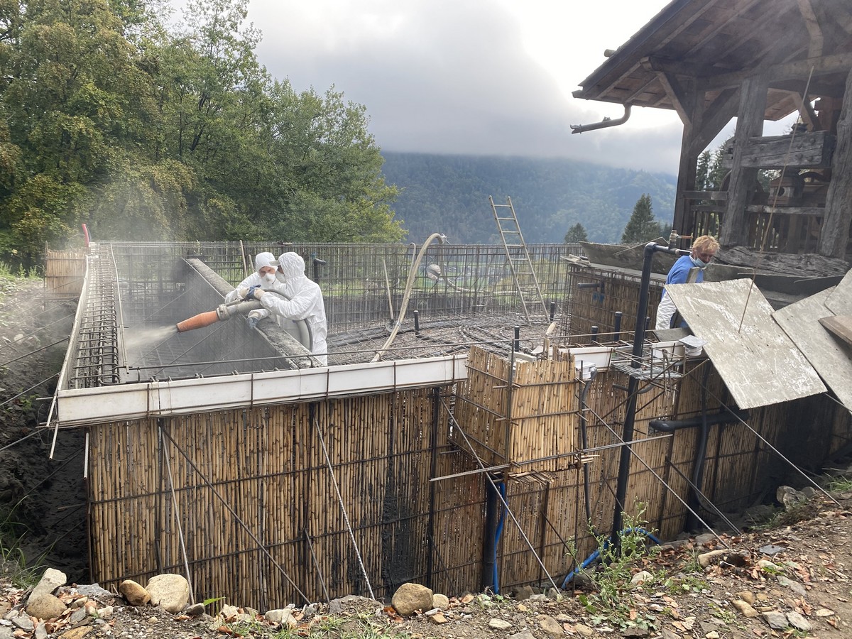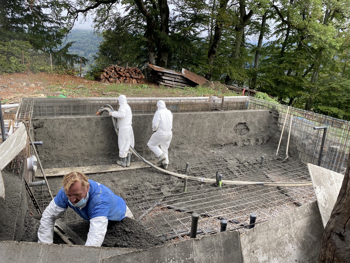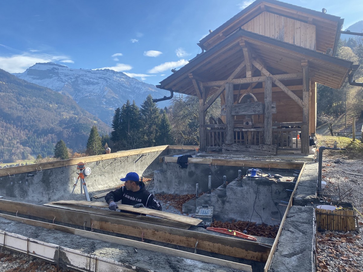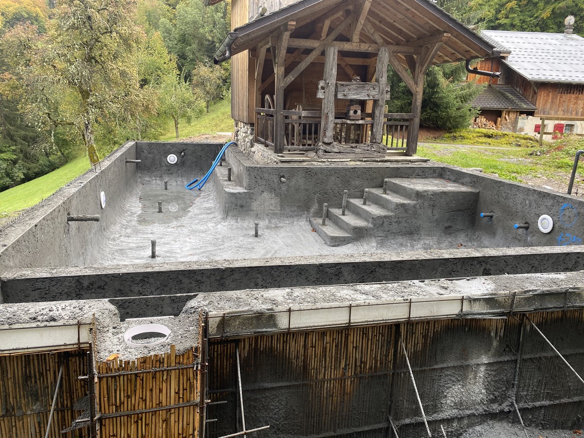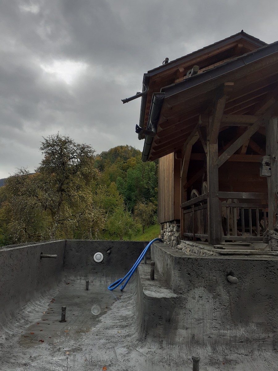Afin d’offrir le luxe d’une piscine face à la montagne, CD a su allier création et savoir-faire pour implanter un bassin en béton projeté autour d’un mazot.