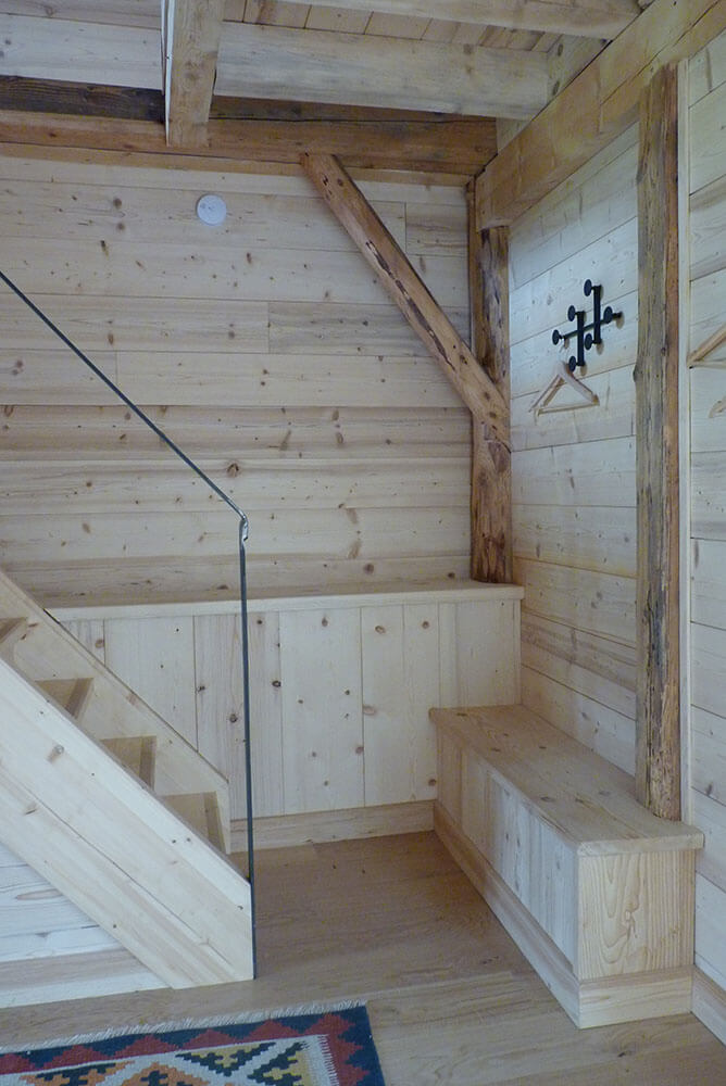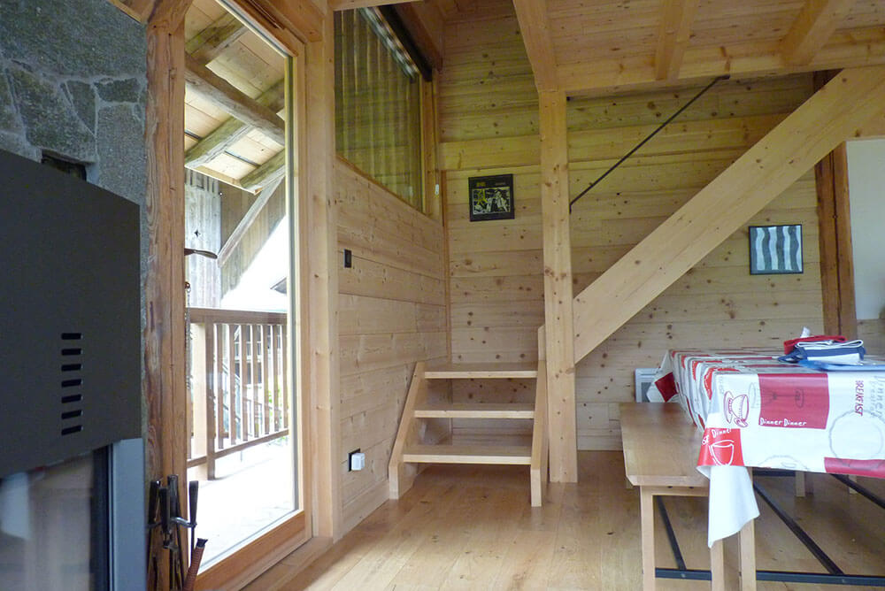 On the first floor: a bathroom, an open kitchen, and a living room around a wood stove