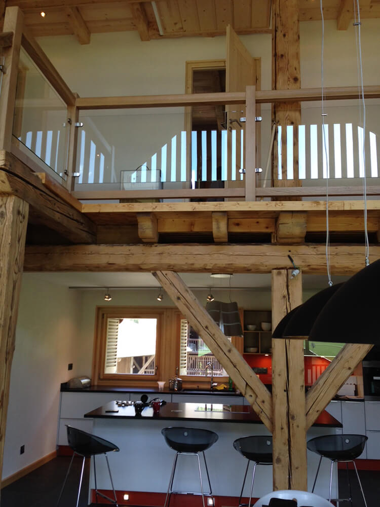 Upstairs: The main residence with a laundry room, a large open kitchen on a cathedral dining room, a gable all open, a small balcony, and a large cozy lounge around a fireplace.