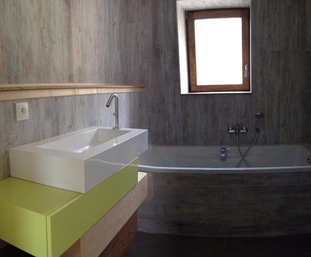 Ground floor: an apartment to receive cycling teams (2 bedrooms and 2 bathrooms, an open kitchen on dining and living space), and a laundry.