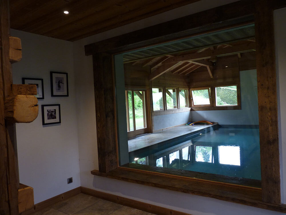 On the garden level: a large kitchen with central island, a dining room, a large terrace, a small TV lounge and extra: an indoor swimming pool visible from the living spaces