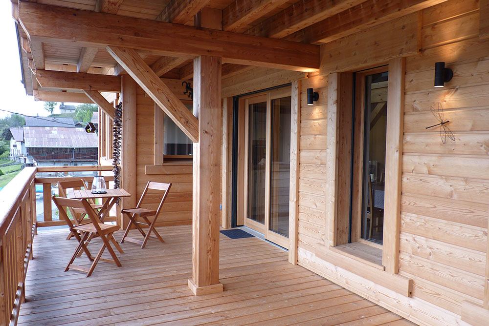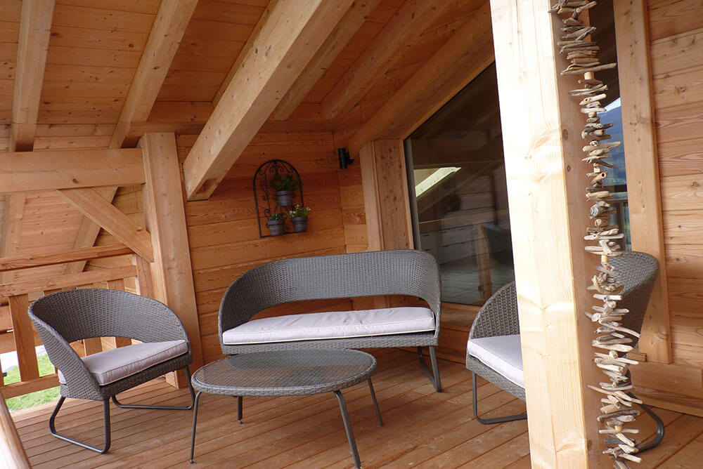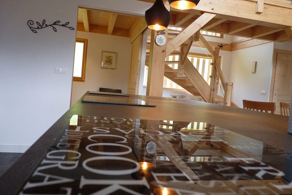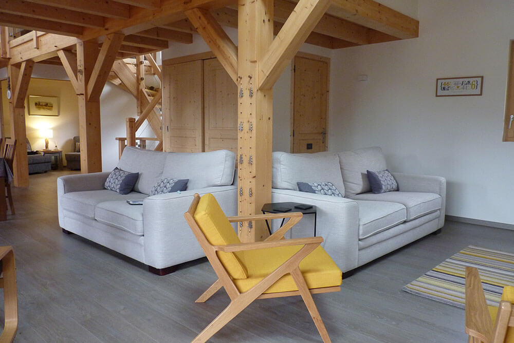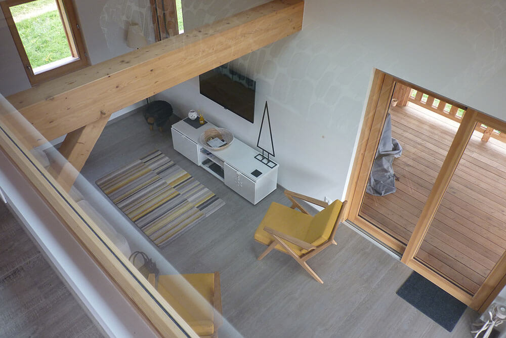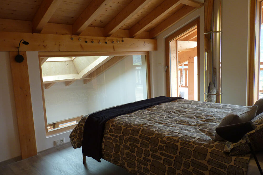 Under the roof: a dormitory and a master bedroom en-suite with a view out to the living spaces and mountains.